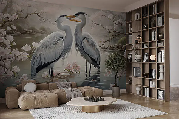 748.34 грн449.00 грнФотошпалери Пара білих птахів стоїть у воді з рожевими квітами