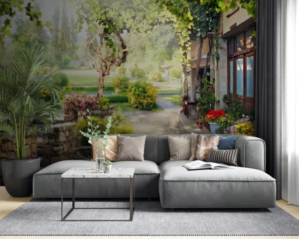 Фотошпалери Фотошпалери Кам'яна доріжка з деревом і квітами (Артикул: u60046)