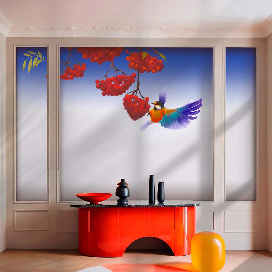 Фотошпалери Птах, що їсть гроно червоних ягід
