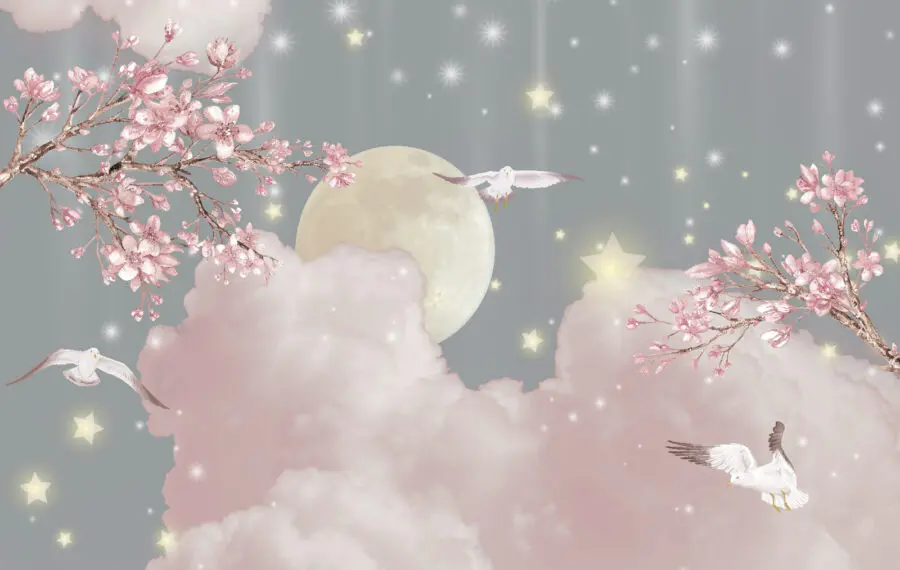 163.88 грн98.33 грнФотошпалери Рожево-білий міський пейзаж з рожевими повітряними кульками та птахами, що летять