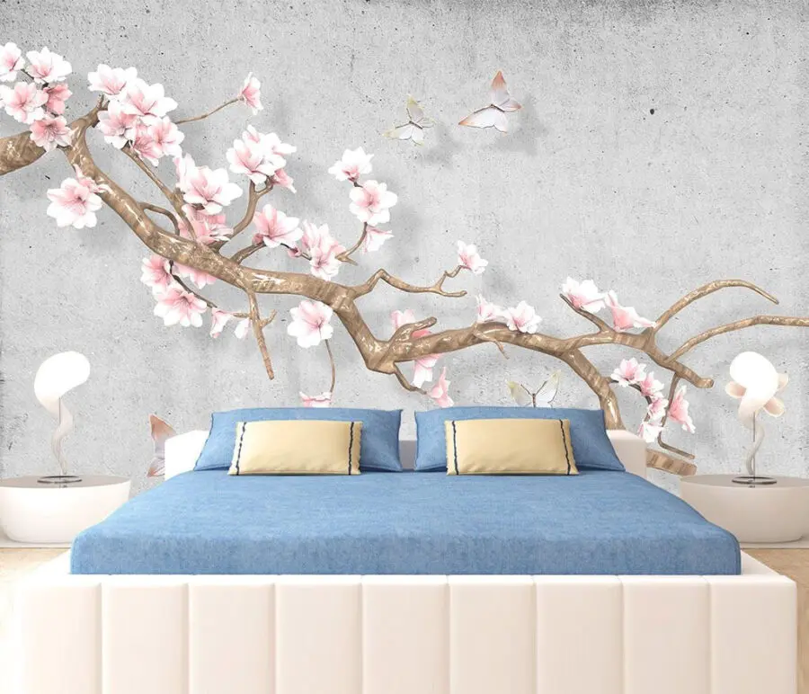 Фотошпалери Гілка з рожевими квітами та метеликами