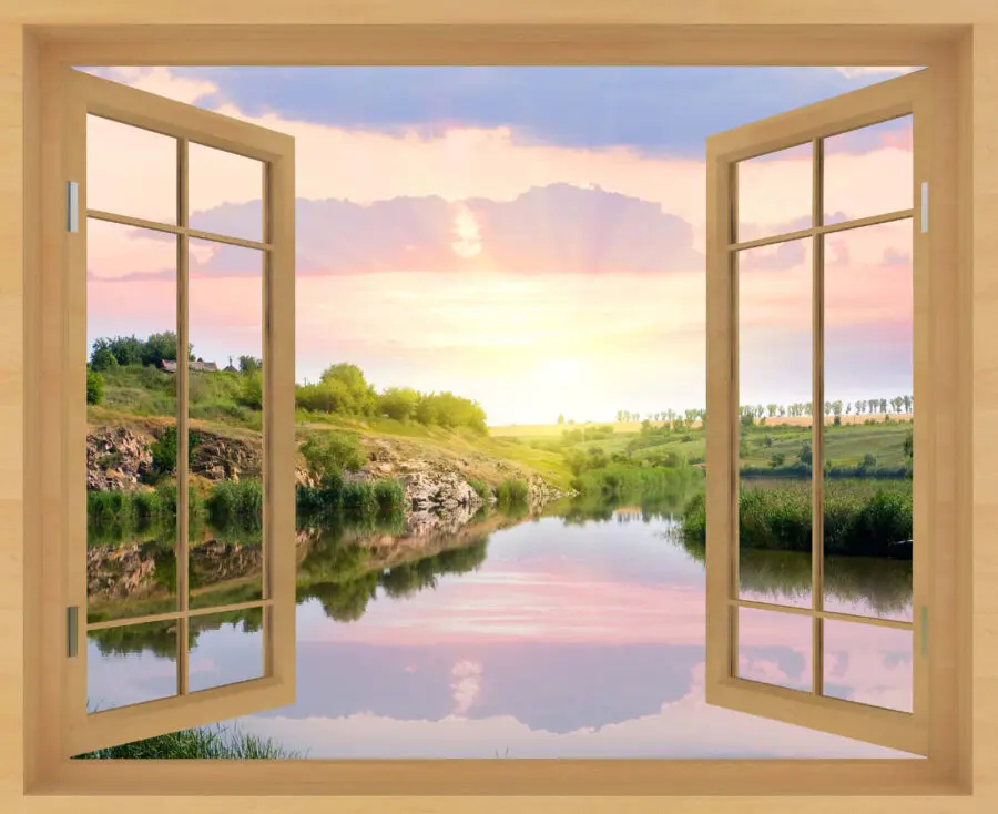 Фотошпалери Вікно з видом на річку і трав’янистий пагорб