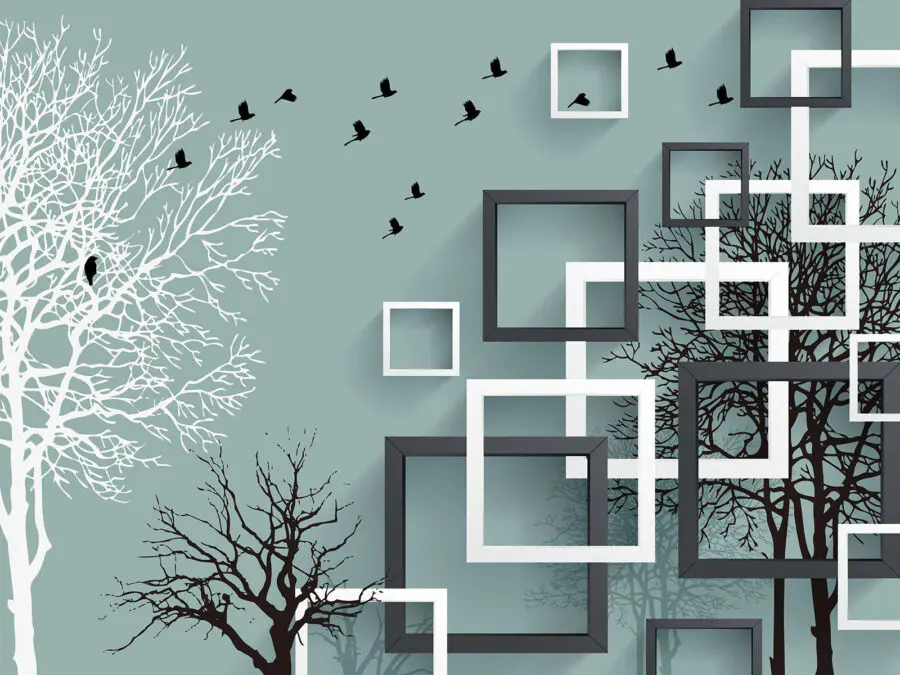 Фотошпалери Настінний розпис з деревами та птахами, що летять
