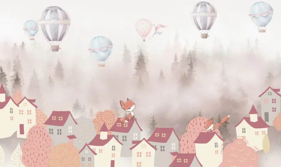 Фотошпалери Карикатура на лисицю на даху міста з повітряними кулями
