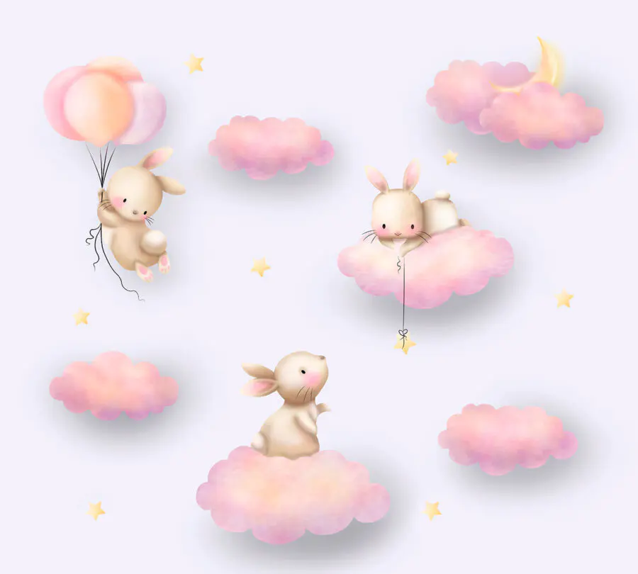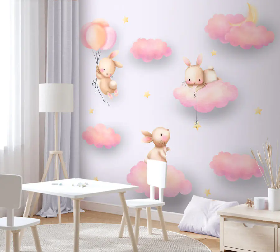 172.50 грн103.50 грнФотошпалери Група рожевих хмаринок і зайчик з повітряними кульками