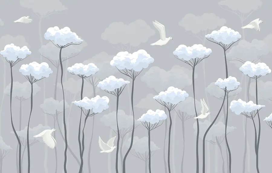 Уявіть, що ви потрапляєте до безтурботного лісу, над яким пропливають пухнасті хмари та граціозні птахи, наче у мрійливому сні, з якого не хочеться прокидатися. Цей фотошпалери "Птахи, що летять у хмарах" перетворить будь-який простір на умиротворений куточок, ідеальний для тих моментів, коли життя здається надто метушливим. Уявіть, як він прикрашає вітальню або затишний куточок для читання, роблячи кожен день схожим на погожу неділю. М'які кольори викликають відчуття спокою, перетворюючи звичайну стіну на вигадливу небесну втечу. Хто б не хотів відчути, що у нього вдома є шматочок неба? Це наче м'яке нагадування зробити паузу, вдихнути і дозволити своїм турботам злетіти разом з птахами. Ідеальний для всіх, хто любить красу природи, він легко вписується в інтер'єр, додаючи лише потрібну нотку магії.