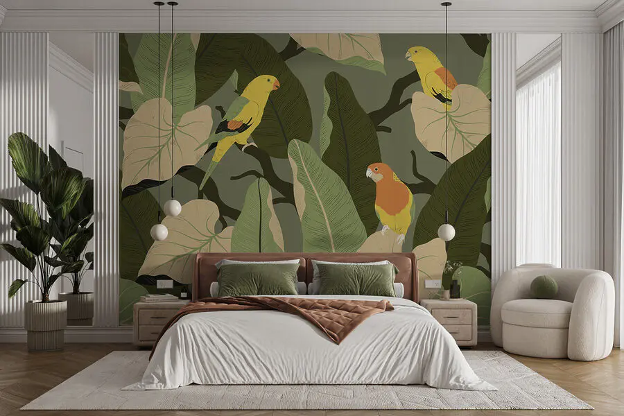 Фотошпалери Різнокольорові птахи на гілці дерева