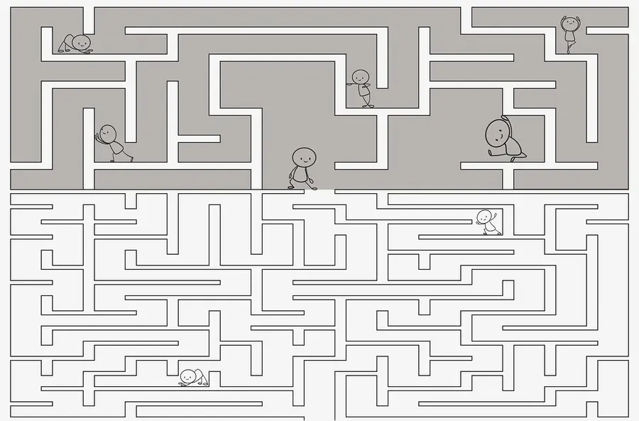Фотошпалери Гра-лабіринт з мультяшними чоловічками, що ходять по землі