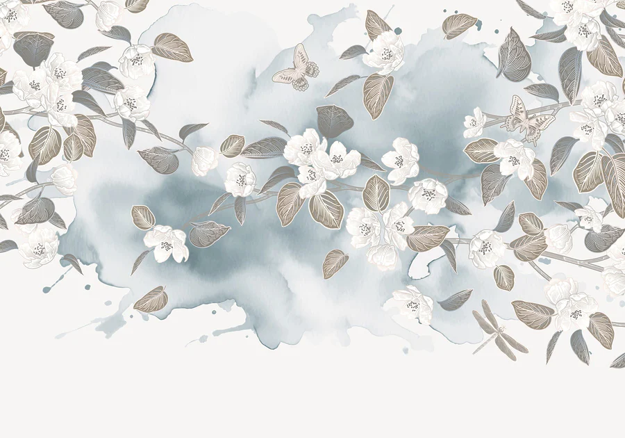 Фотошпалери Білі квіти та листя на блакитному тлі