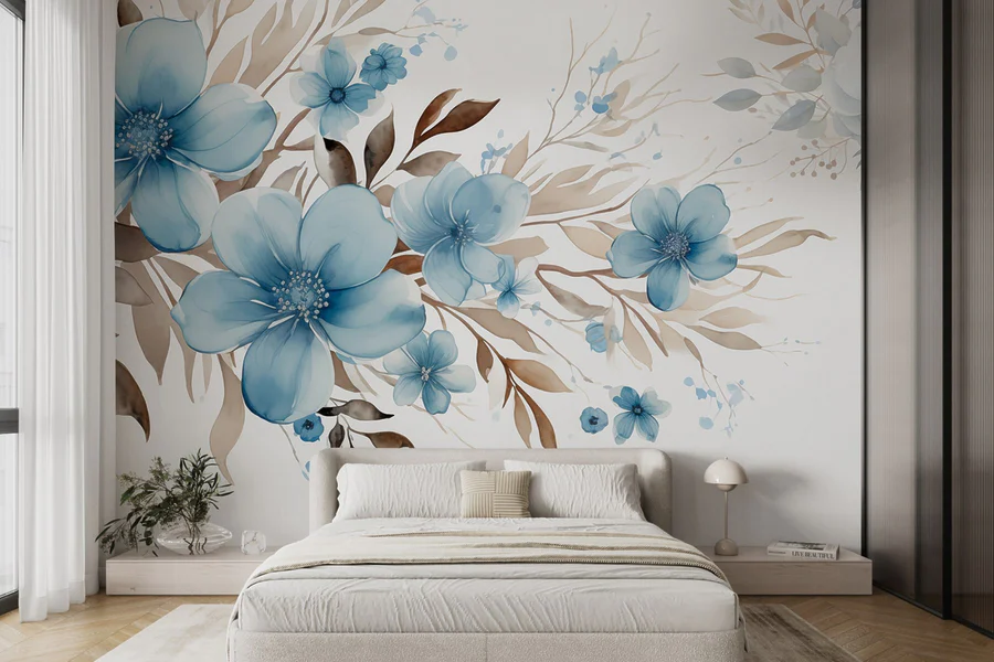 Фотошпалери Малювання блакитних квітів і коричневого листя