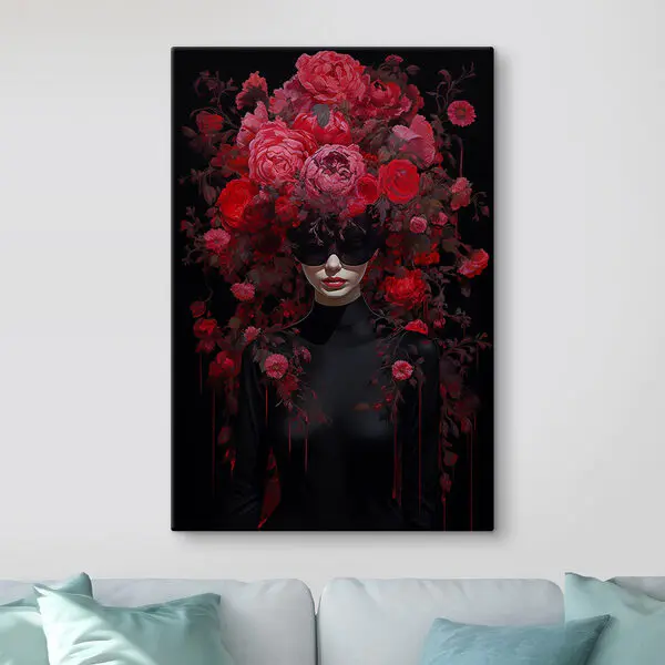 456.00 грн250.80 грнКартина Жінка з довгим чорним волоссям в оточенні червоних квітів