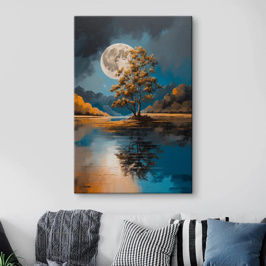 Картина Дерево на озері з повним місяцем на задньому плані