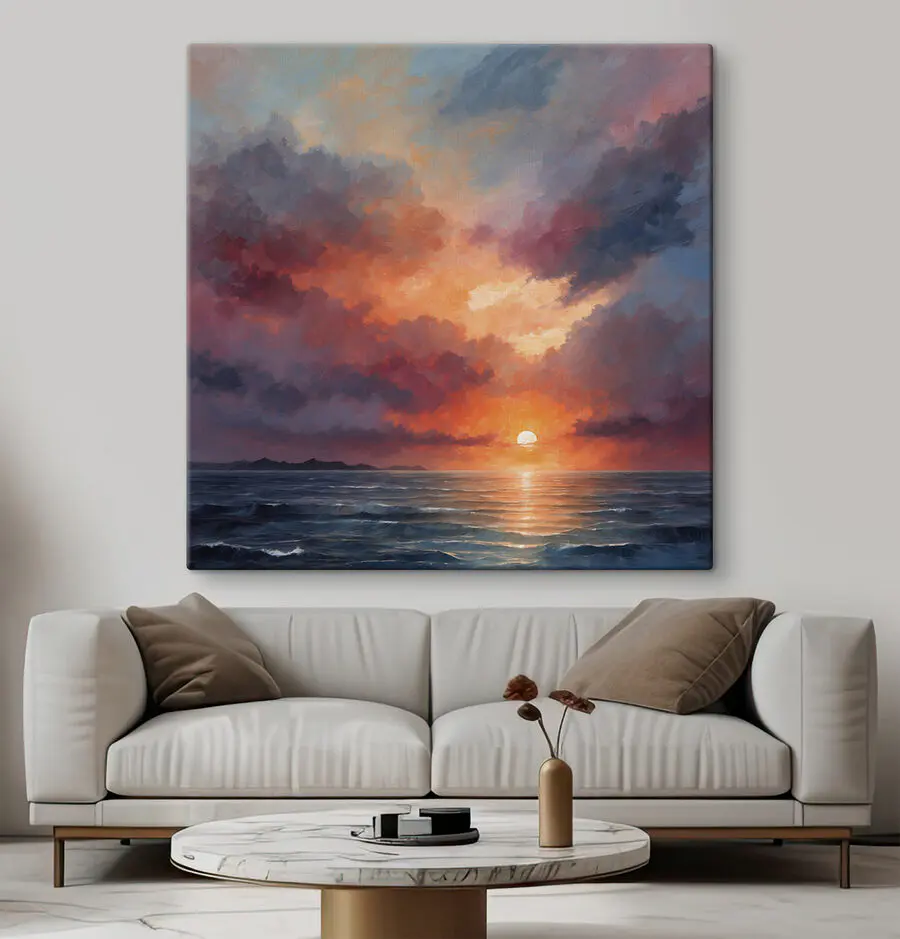 Цей полотно з принтом «Захід сонця над океаном» — це як затишні обійми для ваших стін. Уявіть собі: після довгого дня ви занурюєтеся в улюблене крісло, піднімаєте погляд і бачите його — сяючий, теплий і спокійний. А які кольори! Вони танцюють, ніби мають таємницю, розбризкуючи по вашому простору шелест морського бризу. Це не просто мистецтво, це маленький шматочок спокою. Ідеально підходить для тих, хто мріє про океан або просто потребує приголомшливої втечі. Ваша кімната дзвонила — це те, чого вона хоче.