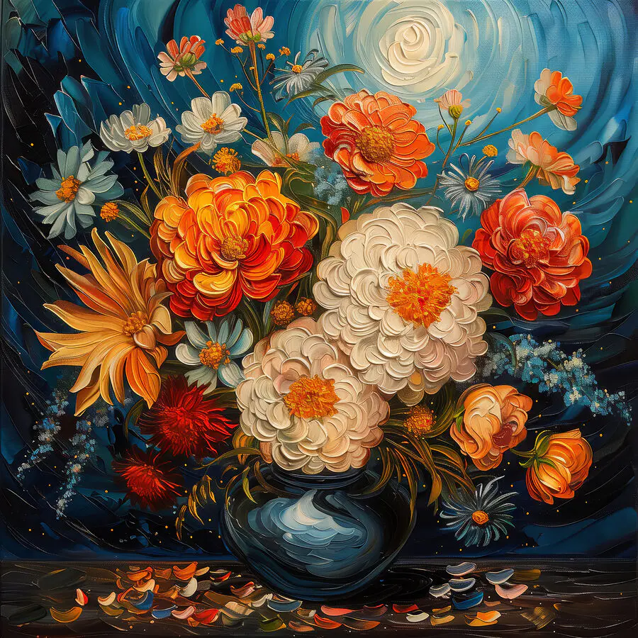 Прикрасьте будь-яку кімнату цим яскравим полотном із зображенням квітів у вазі. Це наче перенести веселий сад у кімнату, не турбуючись про лійку! Уявіть, як ви проходите повз нього, і раптом відчуваєте, що весна триває цілий рік. Живі кольори танцюють разом, створюючи радісну атмосферу, перед якою важко встояти. Ідеально підходить для вітальні або затишного кабінету, додає характеру і тепла, завдяки чому гості почуватимуться як вдома. Подумайте про розмови, які він може викликати, або про посмішки, які він може принести, непомітно перетворюючи простір на маленьке святилище щастя. У поєднанні з м'яким освітленням або вигадливою книжковою полицею цей виріб перетворює будь-яку стіну на власний маленький витвір мистецтва.