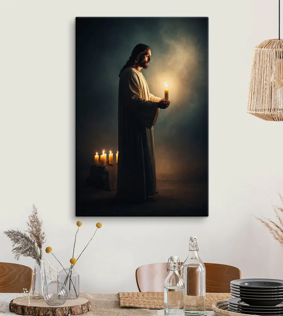 Пориньте в безтурботне сяйво цього чарівного полотна. На ньому зображено фігуру зі свічкою, що випромінює тепло і спокій. Уявіть, як вона прикрашає ваш житловий простір, миттєво піднімаючи настрій. М'яке мерехтіння свічки запрошує до спокійних моментів і тихих роздумів, що робить його ідеальним для затишних вечорів або мирних ранків. Цей витвір мистецтва не лише відображає відчуття духовності, але й спонукає до розмов - уявіть, як гості занурюються в його історію, попиваючи каву. Це більше, ніж просто декор. Це делікатне нагадування зупинитися і цінувати світло в житті.