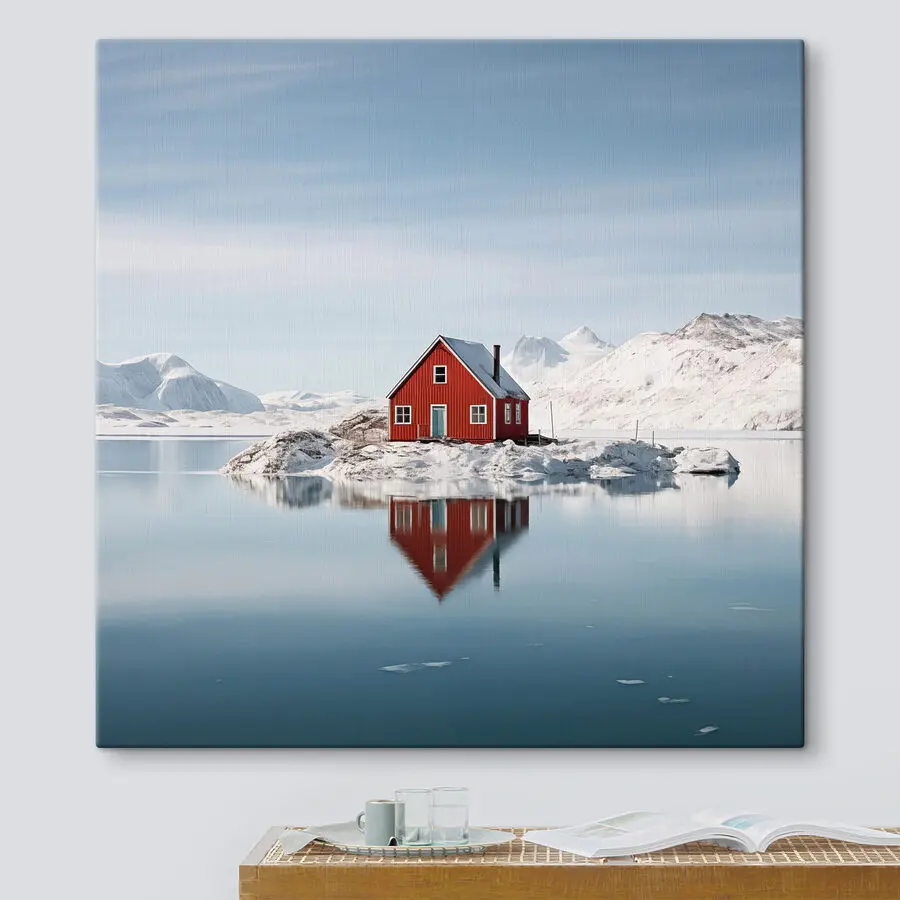 Картина Червоний будинок на острові у воді на тлі засніжених гір