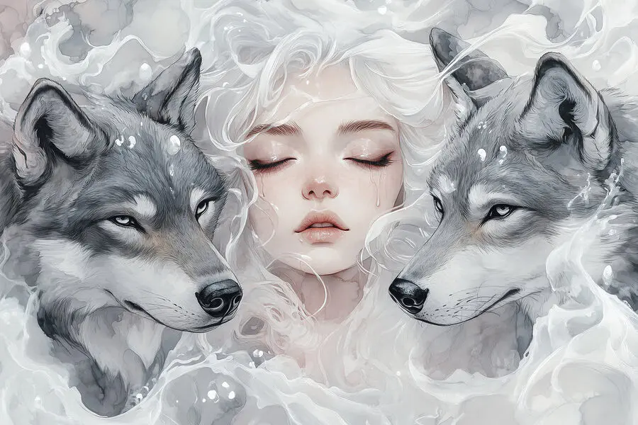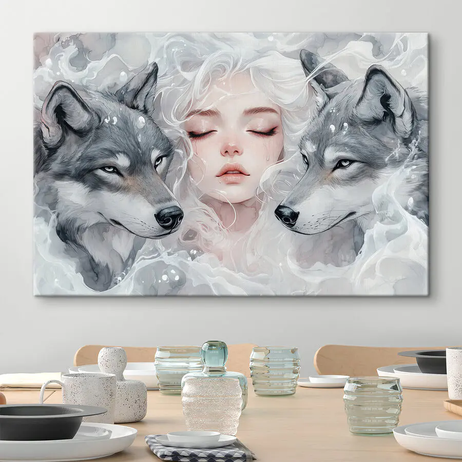 Перетворіть будь-який простір з цим приголомшливим принтом на полотні "Жінка з білим волоссям і двома вовками". Він ніби запрошує містичну мить у вашу вітальню. Уявіть собі: м'які пасма білого волосся спадають на тлі лютих поглядів двох величних вовків, випромінюючи силу та спокій. Це не просто мистецтво, це тема для розмови. Можливо, вона надихає на думки про дикі пригоди або затишні вечори - кого б це не зачарувало? Повісьте її у своєму улюбленому куточку, і нехай атмосфера зміниться. Це дотик примхи, загорнутий в елегантність - прекрасне нагадування про зв'язок між людиною і природою. До того ж, хто не любить трохи вовчої мудрості?