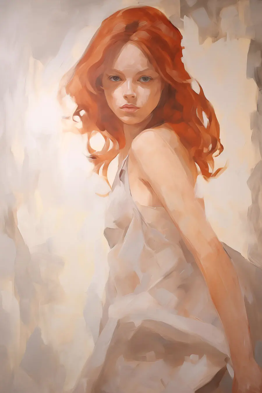 Пориньте у світ омріяної елегантності з цим принтом на полотні із зображенням жінки в струмливій білій сукні. Її руде волосся танцює, наче полум'я, на м'якому, приглушеному тлі, створюючи атмосферу, яка відчувається одночасно спокійною та одухотвореною. Уявіть цей витвір у затишному куточку, і він миттєво підніме ваш простір. Він ніби запрошує вас зупинитися і замислитися, спонукаючи до розмов про красу та витонченість. Цей принт ідеально підходить для куточка для читання або настінної стіни, поєднуючи в собі витонченість і теплоту. Повісьте його і спостерігайте, як він перетворює вашу оселю на галерею почуттів - нагадування про яскраві моменти життя. До того ж, невелике нагадування про те, що іноді в простоті криється найбільша глибина.