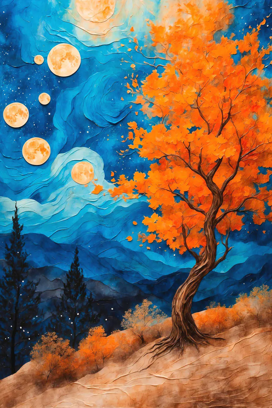 Картина Картина дерева з помаранчевим листям і синіми горами
