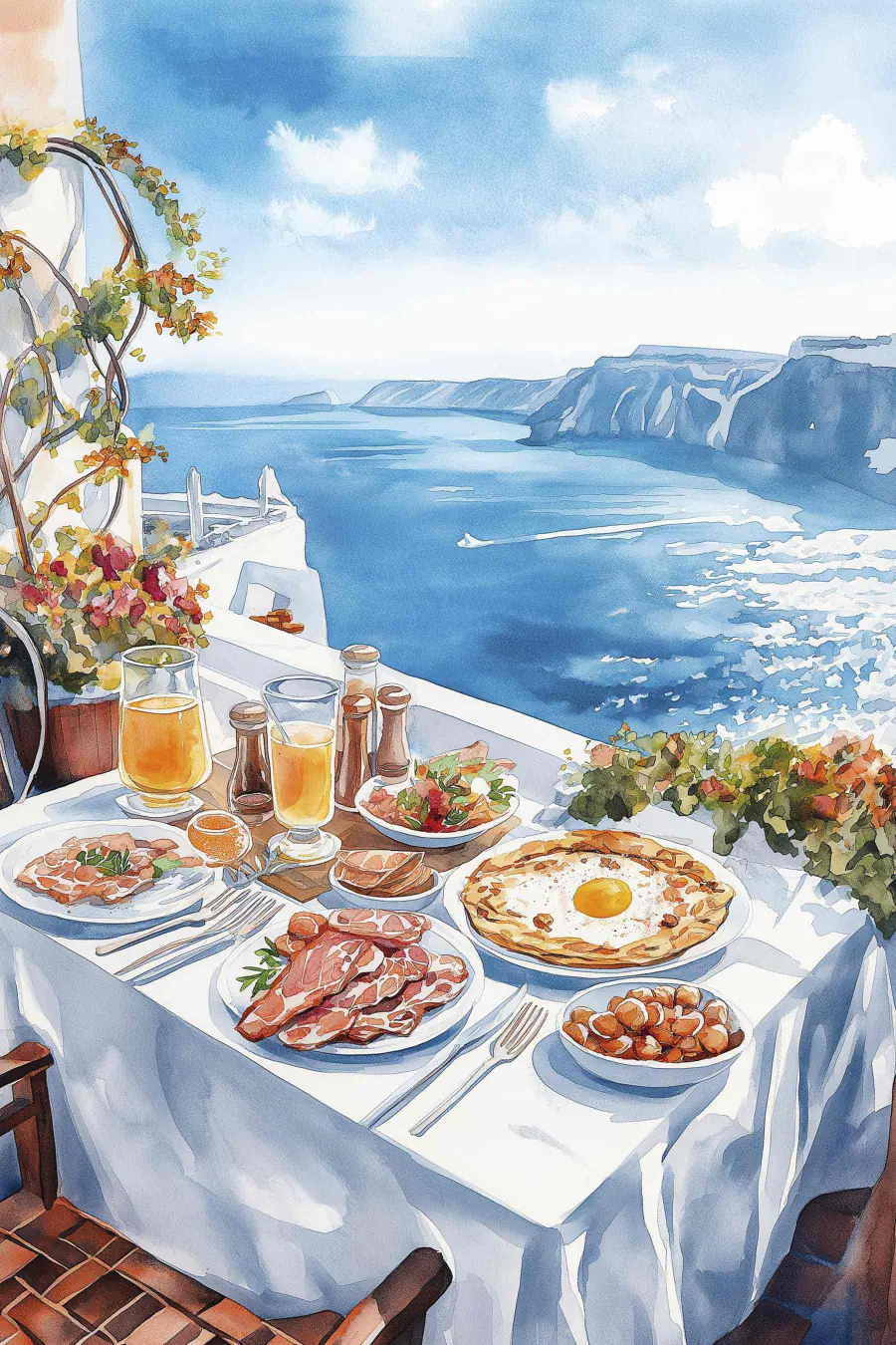 Картина Акварельний живопис їжі на столі з видом на водойму