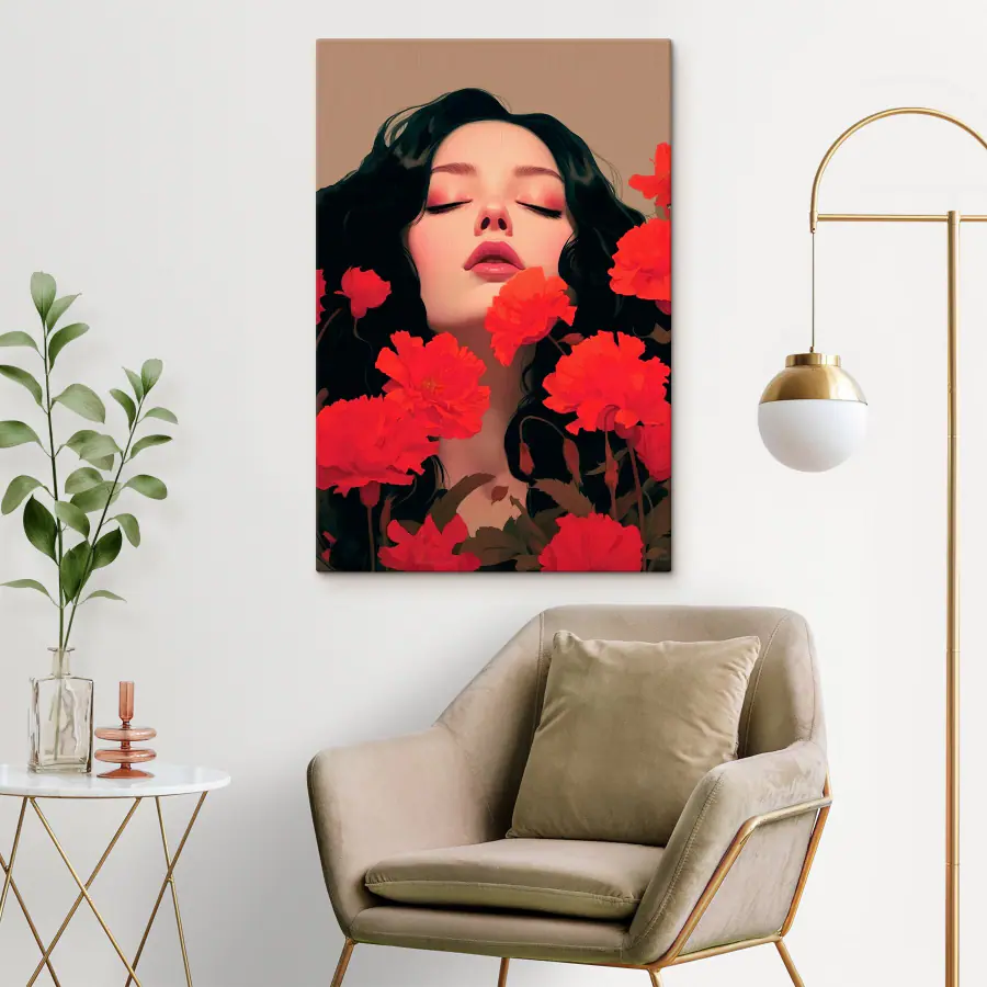 Картина Жінка з довгим чорним волоссям в оточенні червоних квітів
