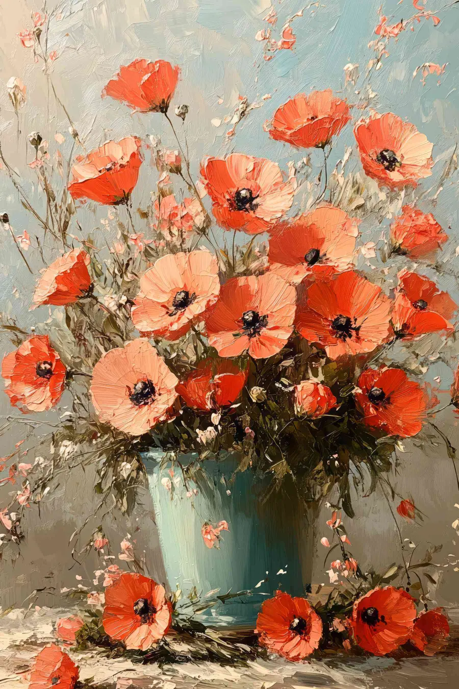Прикрасьте будь-яку кімнату цим веселим полотном із зображенням квітів у чарівній синій вазі. Це наче перенести шматочок саду в кімнату - але без набридливих бджіл! Яскраві відтінки помаранчевого на м'якому тлі ідеально підходять для того, щоб додати краплину радості до похмурих стін. Уявіть, як ви, згорнувшись калачиком на дивані з чашкою чаю, крадькома поглядаєте на цю красу і щоразу відчуваєте себе трішки щасливішими. Будь то затишний куточок чи жвава вітальня, цей виріб може просто вкрасти шоу - або, принаймні, привернути увагу! Чудовий штрих для простору будь-якого любителя квітів.