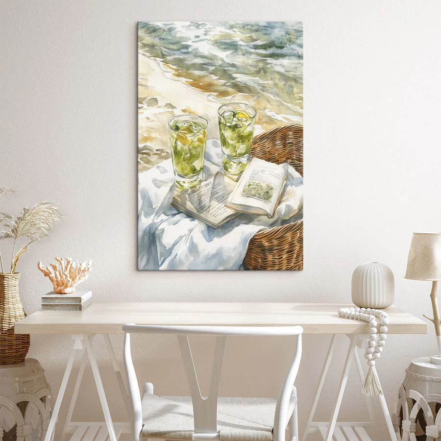 Картина Акварельний малюнок двох склянок холодного чаю та книги на ковдрі на пляжі